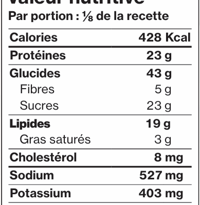 | Glucides | 43 g | ||||||||||||||||||||