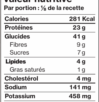 Servir avec les garnitures de votre choix et du pain à grains entiers (facultatif). |